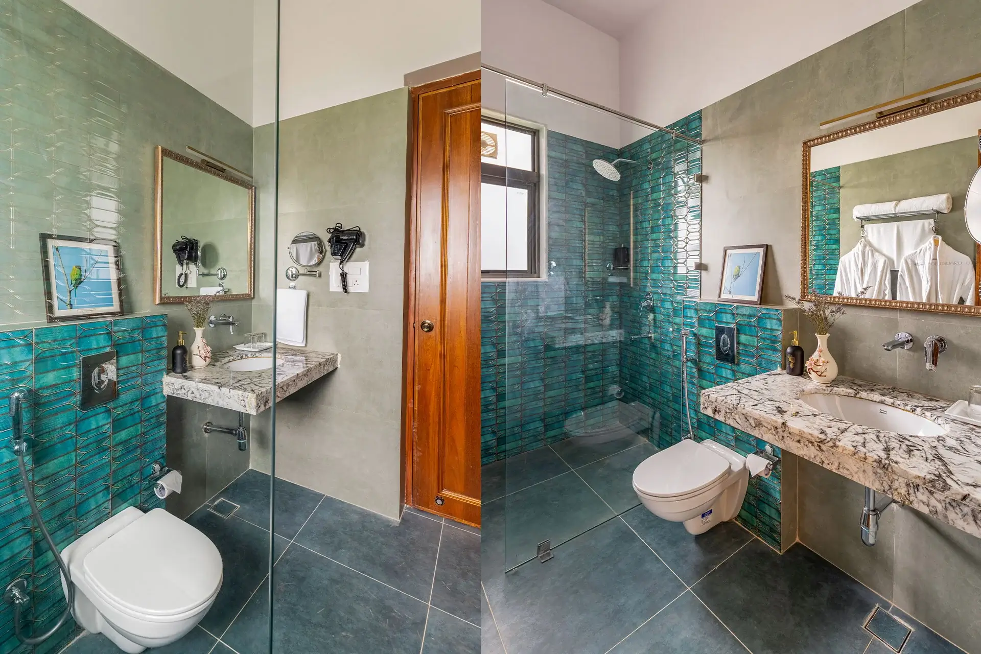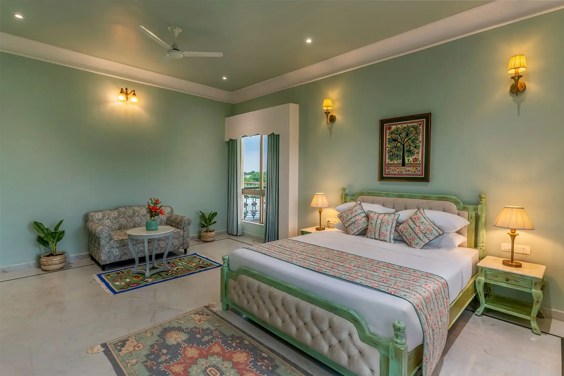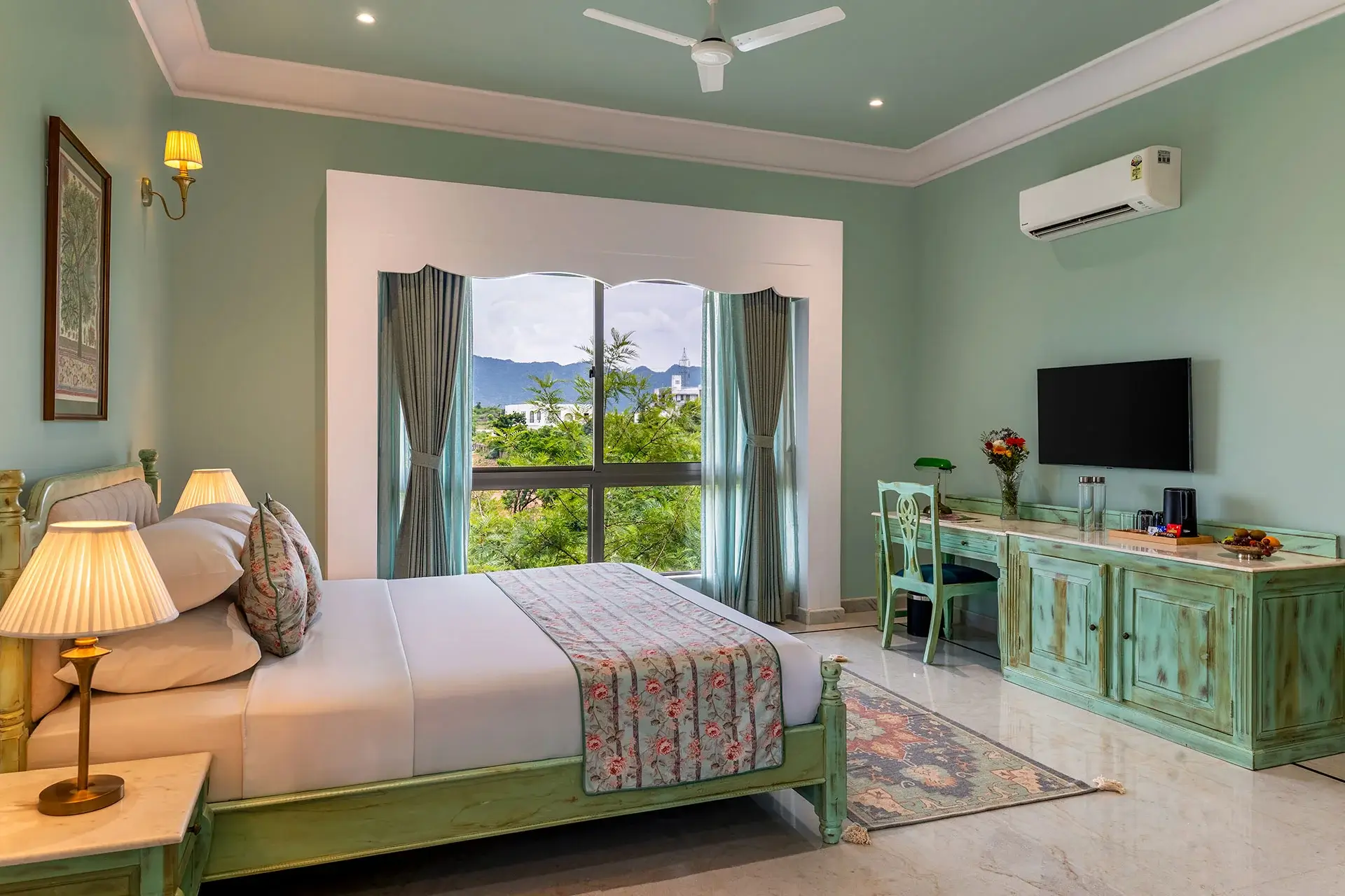 Designed in a rich emerald palette, this room combines spaciousness with tranquility. Ample natural light pours in, illuminating the interiors and creating a soothing contrast with the greenery outside. In the evenings, sunset views add a golden touch.