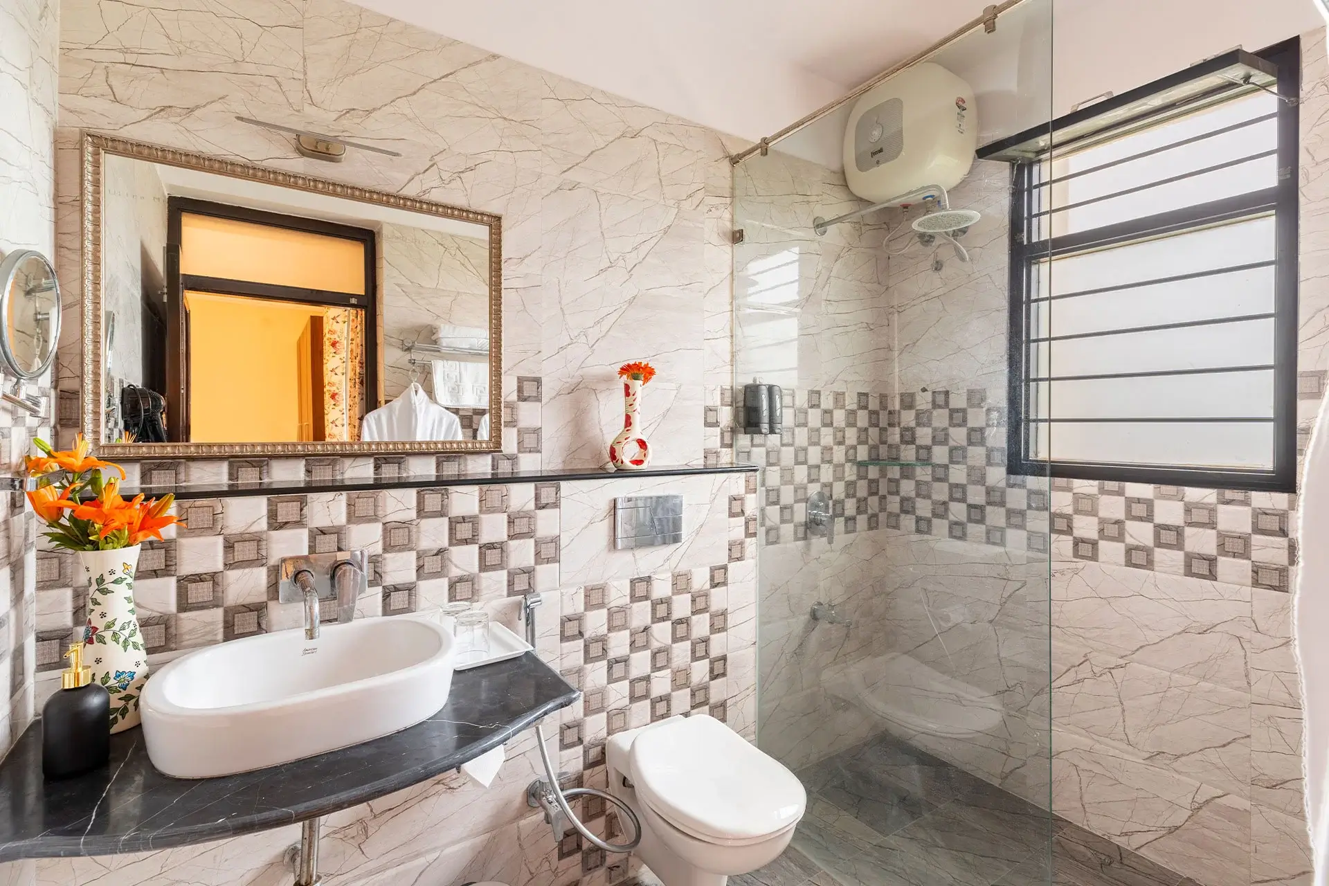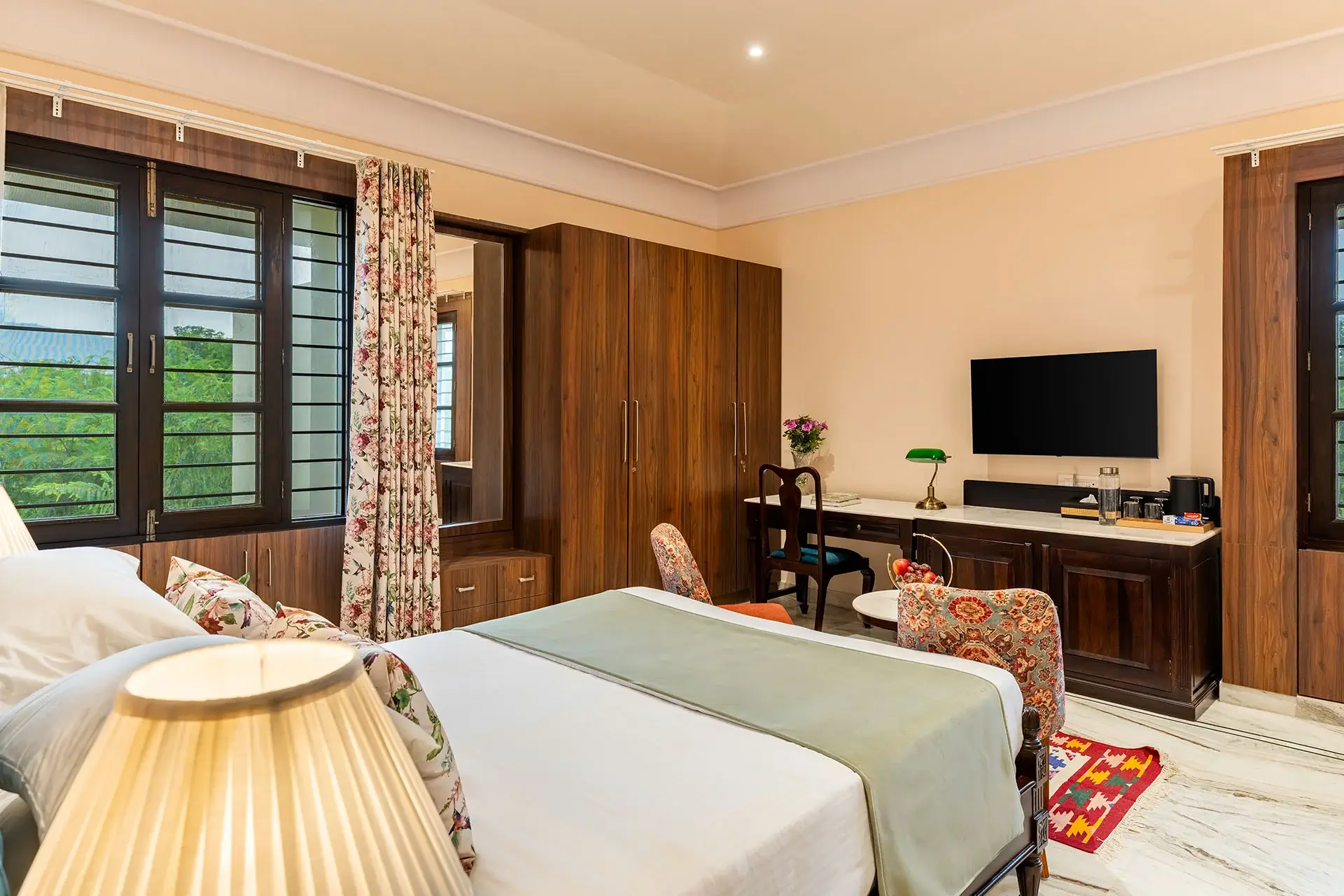 A gentle palette of dusty rose petals creates a soft, romantic ambiance in this room. With a comfortable queen bed, ample sunlight, and greenery views, it is perfect for couples or solo travelers who seek a warm, welcoming vibe.